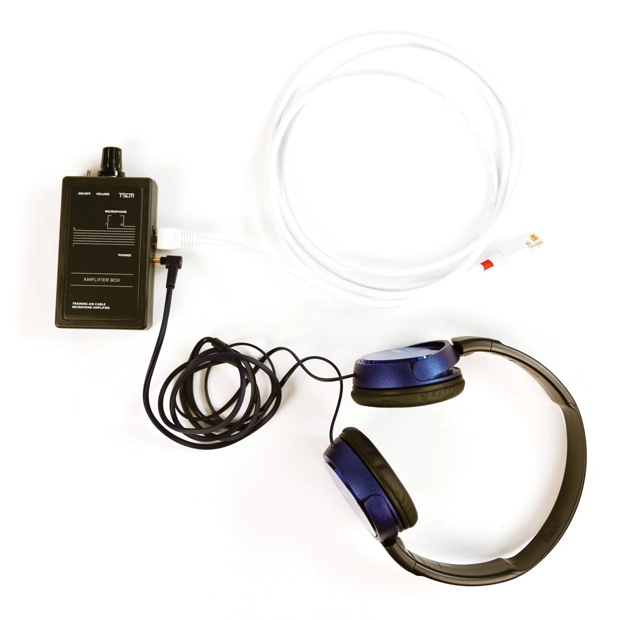 The Trojan is a simple training device that is implemented and operated with ease. Insert the white CAT5 cable into the the socket of the amplifier box. Insert the headphone plug in the socket immediately below the cable connection and switch on.The on/off switch is located on top of the amplifier box, and when the device is on the red LED will be illuminated. Adjust and control the volume by turning the dial, on top of the amplifier box, to a comfortable volume. Trojan is now be fully operational and you will be able to listen in.Does not disrupt the computer accessBusiness operation is normalTraining aid listening device